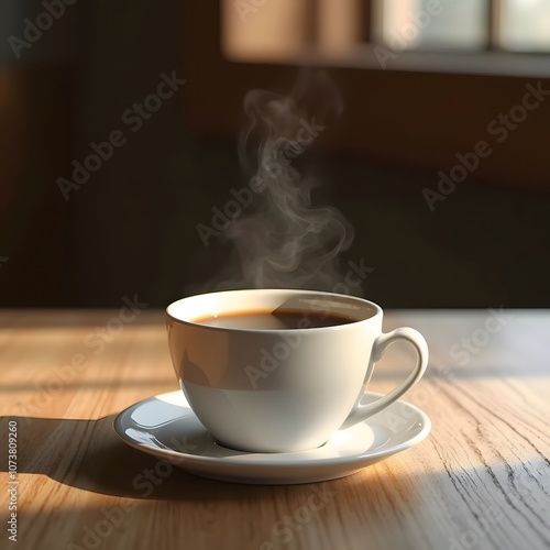 A steaming cup of coffee sits on a notebook beside a notepad and pen in a bright workspace during the morning hours