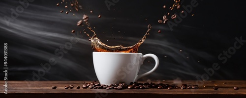 A steaming cup of coffee splashes onto a wooden table with scattered coffee beans