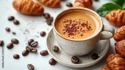 A steaming cup of coffee surrounded by croissants and coffee beans on a light backdrop