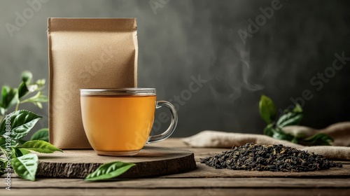 A steaming cup of tea sits on a wooden surface next to a bag of loose leaf tea. The warm colors and steam create a cozy atmosphere.