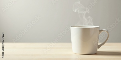 mug, cup, hot beverage, steam, wooden table, hot drink, tea, light background, simple, minimal, clean, cosy, comfort, morning, relaxation, break, pause, calmness, peaceful, serenity, home