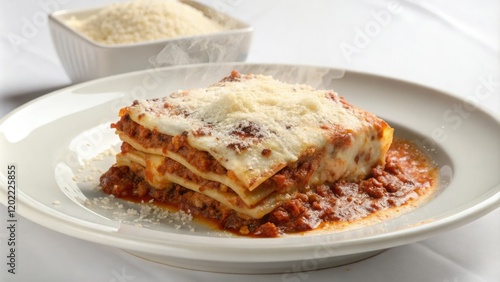 A steaming plate of lasagna with a generous helping of melted mozzarella cheese and a sprinkle of parmesan cheese served on a white ceramic plate, comforting food, lasagna, hot dish