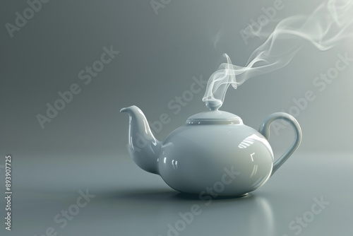 A steaming white teapot sits elegantly on a muted grey background, creating a calming and cozy ambiance.