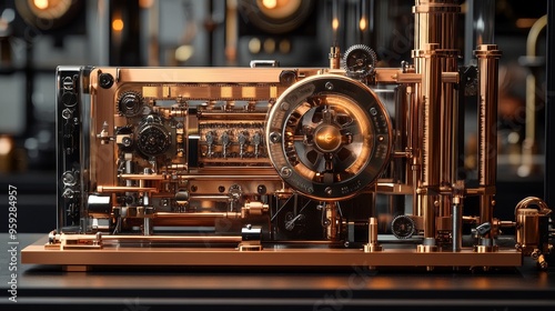 A steampunk machine with intricately designed copper boards, gears, and exposed wiring, showcasing a balance of functionality and artistry, glowing softly