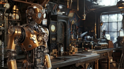 robot, workshop, gear, cog, metal, brass, copper, bronze, machinery, industrial, technology, futuristic, vintage, antique, clockwork, mechanical, goggles, eye, head, body, arm, hand, leg, foot, joint, pipe, wire, cable, light, shadow, table, wall, window, door, floor, background, detail, texture, design, art, science, fiction, fantasy, future, past, present, time