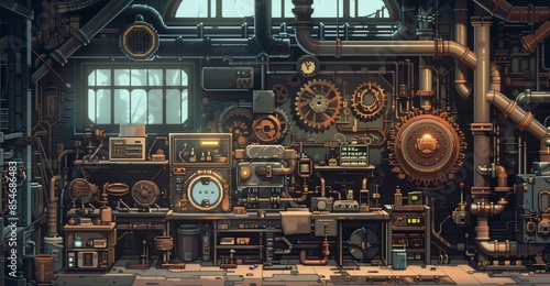 A steampunk workshop with gears, pipes, and intricate machinery , pixel art, game assets