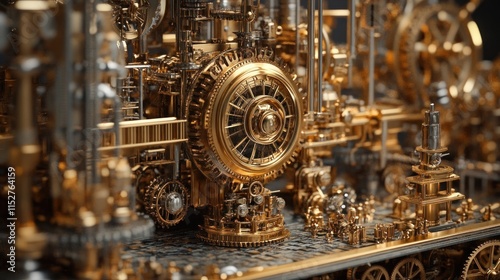 A steampunk-inspired stock cracker factory with intricate brass machinery and clockwork designs,