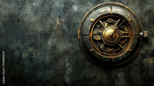 A steampunk-style watch face with exposed gears and dials, set on a metal texture background, offering space for your copy.