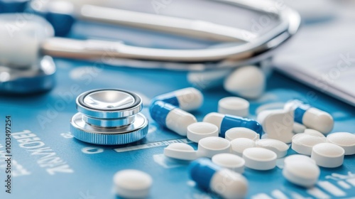 A stethoscope and various pills on a blue medical background.