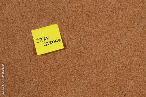 a sticky note with "stay strong" positive motivational phrase at the left side over a cork background