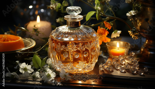A still life of candlelight, flower, vase, table, and flame generated by AI