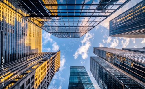 A stock photo shows skyscrapers from below looking up at a blue sky. Buildings stand on either side of the frame.