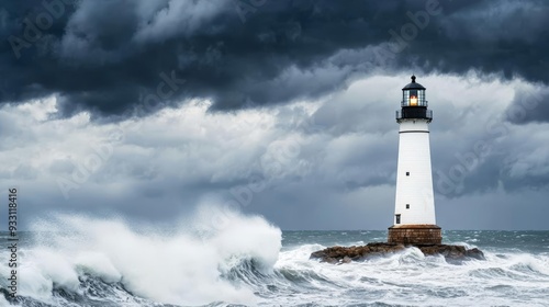 A stormy coastline with dark clouds, crashing waves, and a lighthouse standing defiantly against the storm