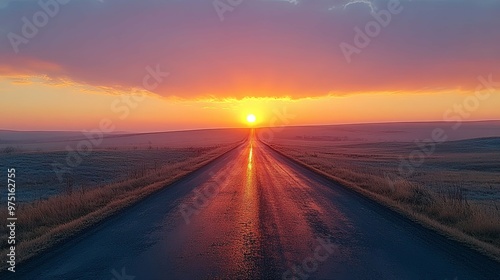 road, straight, path, horizon, sky, sun, setting, sunset, field, grass, yellow, orange, red, purple, pink, cloud, landscape, nature, dusk, evening, light, glow, warm, bright, beautiful, scenic, rural, highway, country, countryside, travel, journey, drive, asphalt