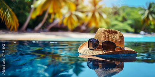 A straw hat and sunglasses rest on the beach, basking in the warm sun and gentle sea breeze. The serene scene exudes relaxation and tranquility.