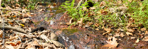 a stream running through the bare roots of trees in a rocky cliff and fallen autumn leaves. banner