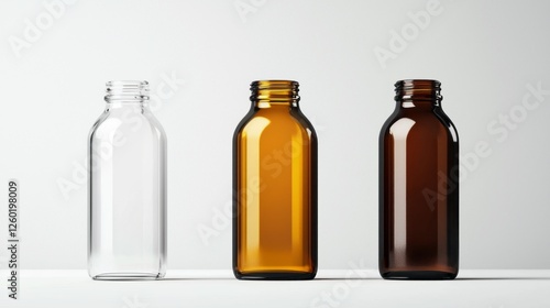 A striking arrangement features three distinct bottles in varying colors: a transparent bottle, an amber bottle, and a dark brown bottle