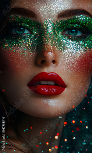 A striking beauty portrait featuring a close-up of a woman's face adorned with vibrant green glitter across her eyes
