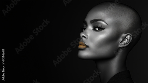 A striking black and white side profile of a person with a shaved head, standing tall and exuding strength. The intense gaze locks with the viewer, while the rich gold lipstick cre