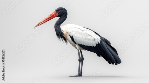 stork, bird, african, wildlife, nature, beak, feather, wing, zoology, avian, ornithology, animal, photo, tropical, fauna, long, leg, birding, white, black, red, standing, grey, background, isolated, closeup, portrait, side, view, open, watching, zoo