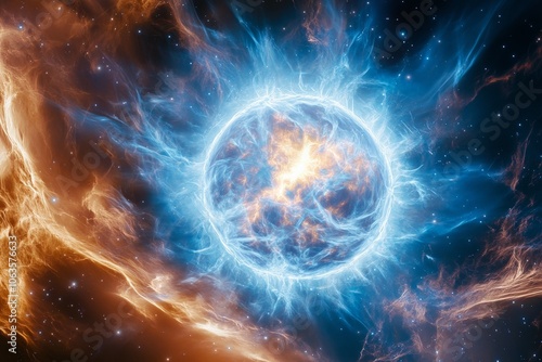 A striking blue celestial body radiates energy amidst swirling star dust and cosmic clouds, evoking a sense of wonder and the vast, untapped potential of the universe.