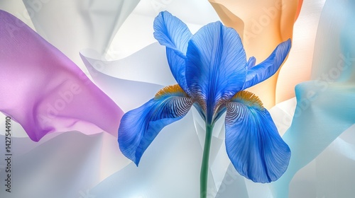 A striking blue iris is set in front of an artistic arrangement of translucent acrylic white paper, forming abstract colored