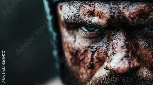 warrior, intense, gaze, face paint, wounded, resilience, battle, war, determination, eye, courage, power, closeup, seriousness, ferocity, mediaeval, combat, tension, sharpened, determined, stare, force, painted face, blood, grim, defiance, tough, serious, toughness, bruise, heroic, intensity, expression, grit, focused, stoic, powerful