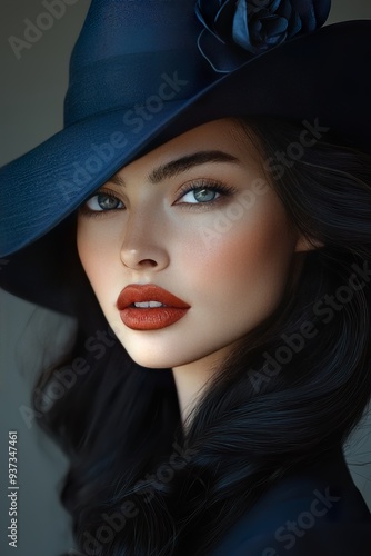 a striking hyper photo realistic woman with long, flowing black hair wearing a stylish, deep blue cloche hat