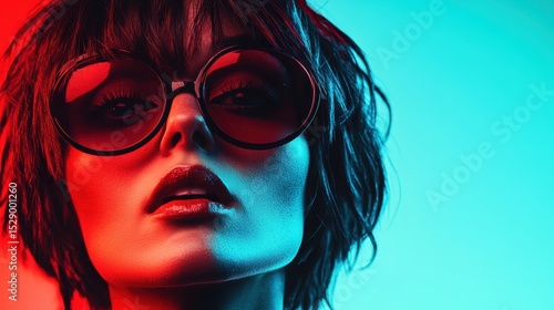 A striking portrait featuring a model with bold blue and red lighting, highlighting artistic expression and modern aesthetics, suitable for fashion and creative projects.