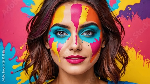 A striking portrait of a woman with colorful paint on her face against a vibrant background
