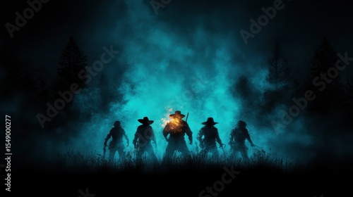 A striking silhouette of cowboys exudes strength and mystery against a foggy dark background, embodying themes of courage and adventure in a suspenseful atmosphere.