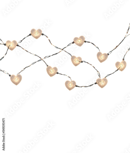A string of glowing heart-shaped lights on a thin wire, emitting a warm, soft yellow glow. These decorative lights create a romantic and cozy ambiance.
