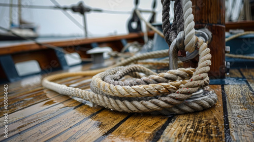 A strong, taut rope is attached to a stainless steel hook on the ship's deck.