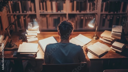 A student sitting at a wooden desk, surrounded by textbooks, late-night studying --ar 16:9 --v 6.1 Job ID: 71a9c7b8-9ed4-4198-884a-d174f72d02cf
