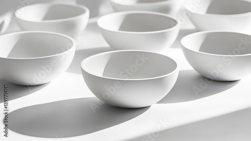 A studio photography shot of white ceramic bowls with a minimalist design