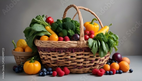 A studio shot of a woven basket filled with a variety of fresh produce against a neutral gray background