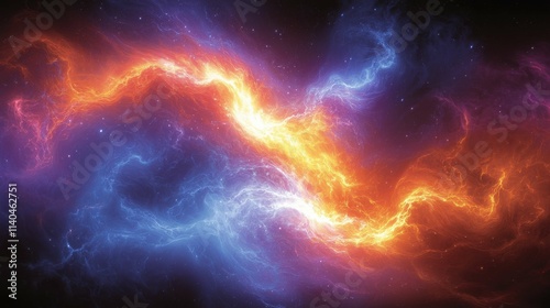 A stunning abstract artwork depicting vibrant energy waves in orange and blue colors, resembling a cosmic scene full of dynamic movement.