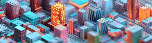 A stunning aerial view of a colorful cityscape showcasing modern skyscrapers and vibrant buildings, ideal for illustrating urban life, architecture, and futuristic concepts.