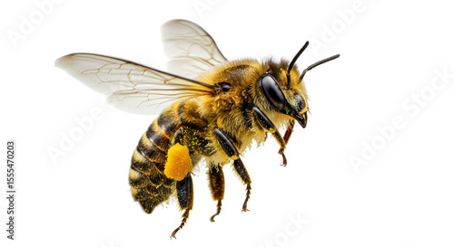 a stunning bee is flying, isolated on transparent background, macro, incredible pollinator, generative AI. Bee Flying with Pollen Close-up on White Background