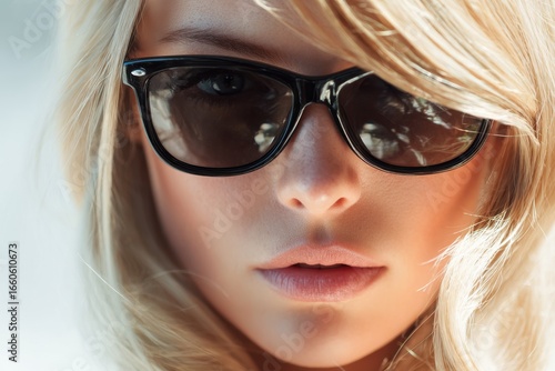 A stunning blonde woman in contemporary black sunglasses against a white background