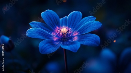 A stunning blue flower radiates a gentle glow as dusk falls, showcasing its delicate petals. The surrounding garden is enveloped in a serene, magical atmosphere