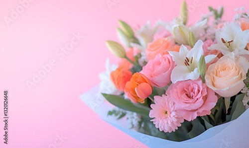 A stunning bouquet of vibrant flowers, elegantly arranged with a mix of roses, tulips, and lilies, Generative AI
