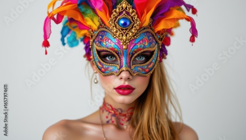a stunning caucasian woman in a vibrant carnival mask stands out against a pristine white background, perfect for advertising campaigns, posters, and more.