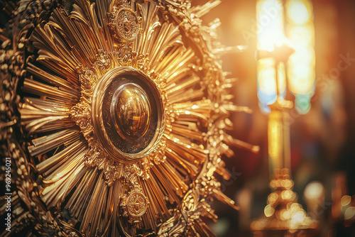 monstrance, catholic, church, gold, closeup, religious, ornate, decoration, worship, altar, faith, spirituality, sacred, light, shine, symbol, tradition, design, craftsmanship, holy, ceremony, art, beauty, detail, vintage, elegant, historical, ritual, devotion, prayer, community, blessing, reverence, icon, heritage, culture, ambience, atmosphere, glow, illumination, intricate, spiritual, gold