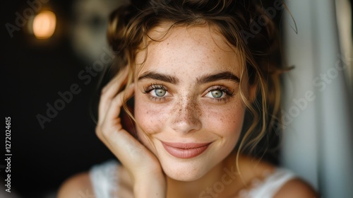 beauty, woman, smile, warmth, freckle, eye, closeup, emotion, expression, nature, connection, personality, confidence, charme, modern, aesthetic, youth, softness, natural, candid, happiness, portrait, serene, lifestyle, fashion, joy, radiant, feminine, delightful, engaging, artistic, contemporary, innocence
