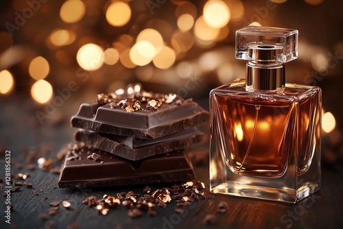 perfume bottle, dark chocolate, indulgence, warm tones, beauty product