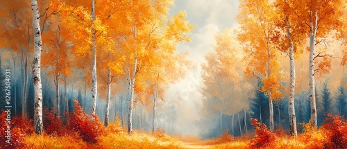 A stunning handpainted autumn landscape in the Impressionist style, featuring semiabstract trees with yellow and red leaves, aspen forest, serene natural beauty, 4K