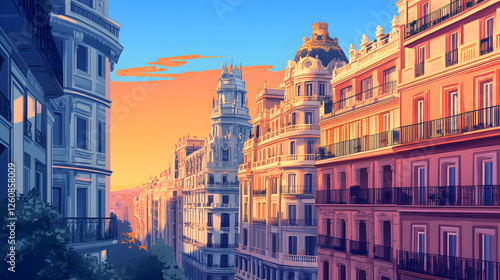 A stunning illustration of Madrid's iconic architecture, featuring the beautiful buildings