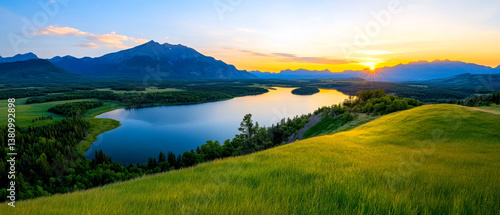 A stunning landscape featuring a serene lake, rolling hills, vibrant green grass, and majestic mountains under a colorful sunset sky.