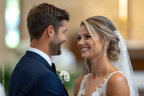 A stunning moment in a wedding ceremony where the bride smiles radiantly at her groom while exchanging vows, encapsulating love, beauty, and shared future hopes of the couple.